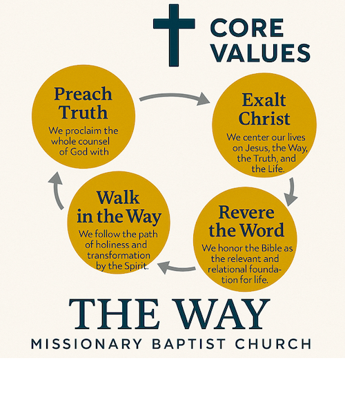 At The Way Missionarv Baptist Church of Selma, Alabama, we exist to exalt Jesus Christ, reverence the living Word of God, and walk boldly in the Way of truth-love-and holiness. Here, the Word is our foundation-it is relevant to every struggle, relatable to every soul, and relational in every season. We are committed to guiding people into a transforming relationship with Christ, built on truth that doesn’t change and love that never fails. We are not just hearers. but doers of the Word, where faith leads to fruit, and teaching becomes testimony.